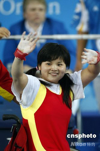 9月9日,北京残奥会举重比赛在北京航空航天大学体育馆展开首日的争夺,在女子44公斤级的比赛中,中国选手肖翠娟以100公斤夺得北京残奥会中国举重队第一枚金牌。 中新社发 盛佳鹏 摄