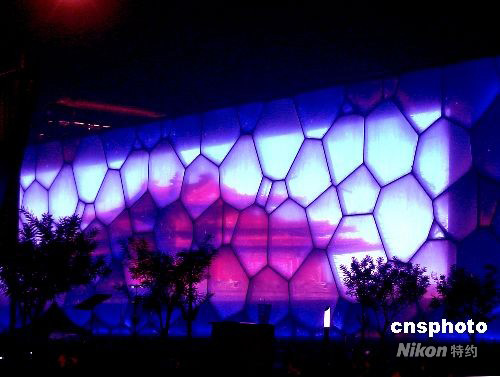 在北京残奥会举办时节,国家游泳中心“水立方”的墙面上投影出著名的故宫角楼图像,更显示迷人的梦幻色彩。 中新社发 贾国荣 摄