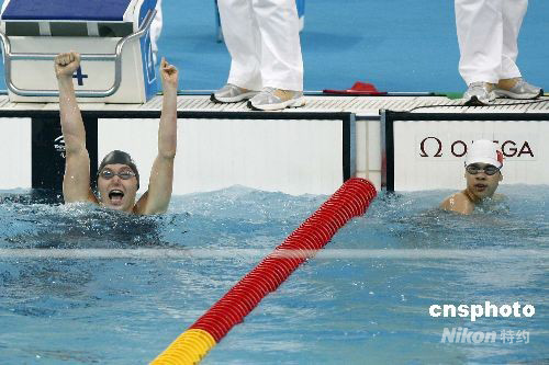 9月10日,北京残奥会男子100米蛙泳SB9级决赛在北京国家游泳中心“水立方”举行,南非选手凯文·保罗(左)摘金,中国选手林福荣(右)获银牌。 中新社发 盛佳鹏 摄