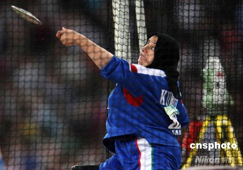 9月10日晚,北京残奥会田径各项比赛继续在北京奥林匹克公园内的国家体育场-鸟巢举行,各国女子大力士在铁饼比赛中竭尽全力向冠军发起冲击。图为头戴黑色头巾的科威特选手玛哈·谢拉扬奋力将铁饼掷出。 中新社发 任晨鸣 摄