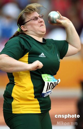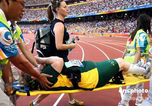 9月12日,北京残奥会田径比赛举行在北京奥林匹克公园内的国家体育场-鸟巢举行,澳大利亚女子铅球选手卡思·普劳德福特在上午进行的女子铅球-F35/36级别的比赛第五次投掷后当场昏厥,被紧急送往医院救治。 中新社发 任晨鸣 摄