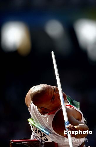 9月12日,北京残奥会田径比赛继续在北京奥林匹克公园内的国家体育场“鸟巢”举行,在男子标枪F53/54级决赛中,墨西哥选手费利克斯·塞佩达“回头望月”。 中新社发 盛佳鹏 摄
