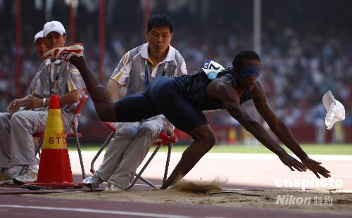 9月12日,在北京残奥会田径男子三级跳远-F11(盲人)比赛中,来自美国的选手莱克斯-吉勒特在比赛中不慎和裁判相撞。 中新社发 杜洋 摄