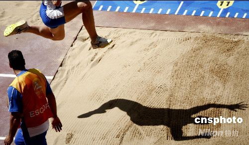 9月12日,北京残奥会田径比赛继续在北京奥林匹克公园内的国家体育场“鸟巢”举行,30岁的中国选手李端在男子三级跳远-F11级别的比赛中以13.33米的成绩获得冠军并打破残奥会纪录,图为希腊选手阿萨纳西奥斯·巴拉卡斯在比赛中。 中新社发 盛佳鹏 摄