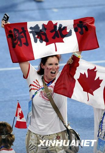 一名加拿大代表团成员举着写有“谢谢北京”字样的国旗入场。