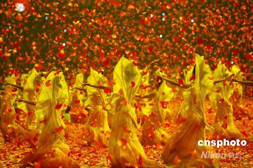 图为文艺演出中红叶纷纷从顶端飘落。 中新社发 杜洋 摄