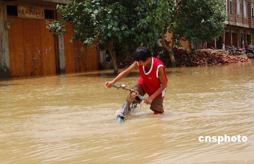 八月六日,广西南宁市横县云表镇一青年骑自行车在积水的大街上行走。被誉为“中国茉莉花之乡”的横县连日普降大到暴雨,造成严重洪涝灾害,上万民众被洪水围困,经济损失近亿元人民币,死亡五人。中新社发 刘万强 摄