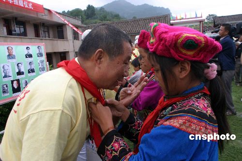 云南省禄劝彝族苗族自治县杉乐村杉乐小学彝族小学生,为粟裕大将之子、北京军区原副司令员粟戎生中将佩戴少先队红领巾。