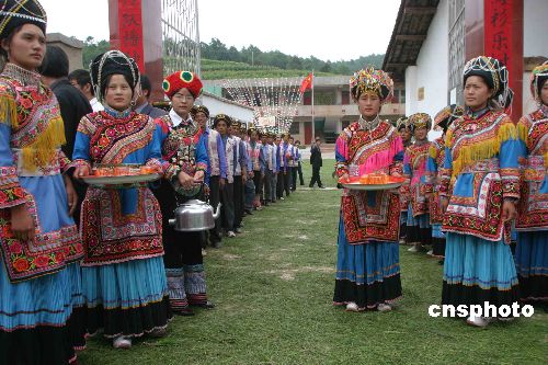 云南省禄劝彝族苗族自治县杉乐村彝族民众端着自酿米酒,像当年迎接长征红军那样欢迎重走长征路的开国元勋子女。