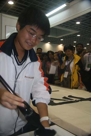 中新网南京9月23日电 记者在今天上午开幕的南京文化产业交易会上了解到,大会的巨字展标是由南京外国语学校高一女生成懋冉书写,每个字一米见方大,用简化字书写,以浑厚的魏楷榜书展现“金陵书风”,充分彰显了古都南京的文化底蕴。一个15岁的少女担纲如此重任,成为本届南京名城会一大佳话。
