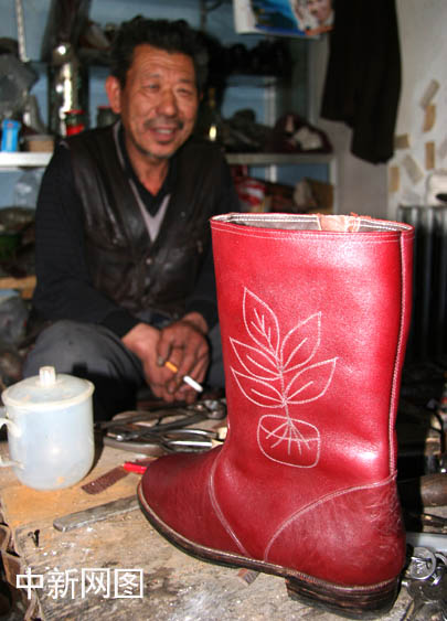 应记者的要求,米佳拿出了他亲手制作的皮靴,暗红色的牛皮靴上还有缝制的花纹,手工制作很是精细,据说米佳从14岁起就开始跟父亲学习皮鞋皮靴手工制作工艺。“制作这样一双皮靴大概要花多少钱呀,”面对记者的问题,米佳大叔说“要200多元吧”,记者又问到,“那现在定制这样皮靴的人还多么?”米佳大叔点点头只说了一句“还是有人要做的”。