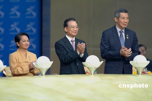 十月三十一日上午,第三届中国—东盟博览会开幕,温家宝和东盟领导人为中国—东盟博览会开幕式剪彩。中新社发 蒋雪林 摄