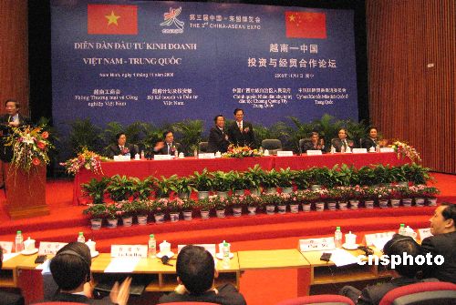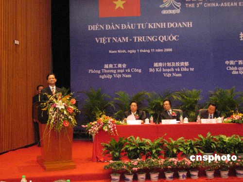 “越南—中国投资与经贸合作论坛”十一月一日在南宁举行,越南总理阮晋勇和广西自治区主席陆兵出席并分别致开幕辞。会议由越南工商会、广西区政府及中国国际贸易促进委员会联合主办。据披露,二○○五年,中越两国贸易额达八十八亿美元,预计今年将突破一百亿美元,提前四年实现两国领导人提出的双方贸易额达一百亿美元的目标。中新社发 杨强 摄
