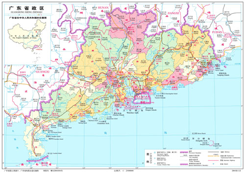 广东位于中国大陆最南部,南临南海,海岸线总长3368公里,岛屿众多。地势北高南低,境内山地、平原、丘陵交错。河流大多自北向南流,主要有珠江、韩江、鉴江等。最长的珠江由西江、北江、东江汇流而成,长2122公里,是中国第三大河流。南海沿岸的珠江三角洲、韩江三角洲土地肥沃,是著名的鱼米之乡。