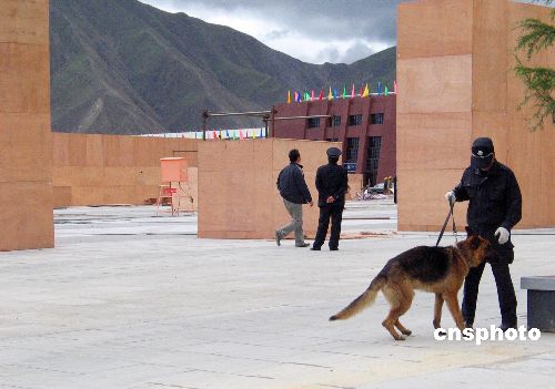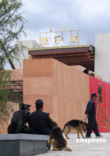 2006年6月28日,即将投入使用的拉萨火车站。作为7月1日青藏铁路线开通庆典会场,工人正紧锣密鼓的施工。为了保障会场的安全,拉萨火车站庆典会场配警犬保安全。中新社发 吴芒子 摄