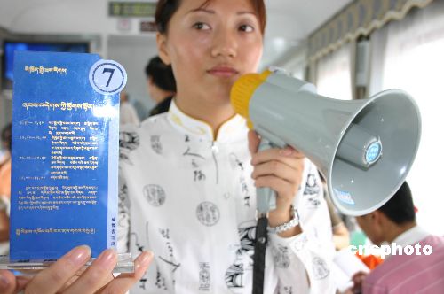 青藏铁路高原列车的餐车环境良好,饮食品种丰富。图为成都-拉萨的T22次餐车乘务员六月三十日展示藏文的菜单。中新社发 杨杰 摄