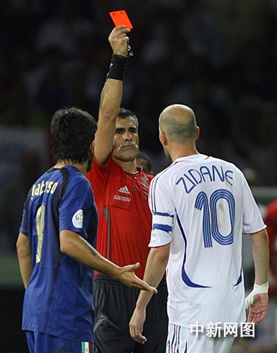 下半时两队在中场的争夺火药味渐浓,法国队大举进攻,双方队员摩擦不断。加时赛第110分钟,意大利后卫马特拉齐和齐达内发生冲撞,此后两个人发生了口角,齐达内一怒之下用头猛顶对方的胸口,马特拉齐仰面倒地。主裁判没有看清楚两个人的冲突,在咨询了边裁后,他出示红牌将齐达内罚下。