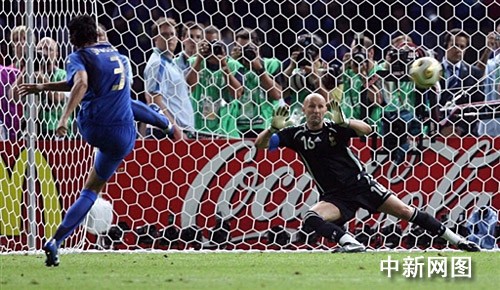 点球决战曾是意大利队心中永远的痛,在此前的三届世界杯上,他们都是在点球大战中被淘汰,分别是1990年的阿根廷,1994年世界杯决赛对巴西,1998年世界杯对法国。点球大战中,皮尔洛首先为意大利队罚中,维尔托德随后也低射罚入,意大利队第二个出场的是本场比赛的“风云人物”马特拉齐,面对强大的压力,他主罚将球送入,法国队第二个出场的特雷泽盖罚出皮球击中横梁后弹到球门线后弹出,没有罚中。此后,意大利队德罗西和皮耶罗相继命中,法国队也是两罚两中,比赛的焦点落到了意大利队最后一个出场的“神奇的左后卫”格罗索。这名高大的左后卫面对巴特斯大力抽射,巴特斯没有沾到皮球,意大利队在点球大战中五罚全中以5比4胜出!