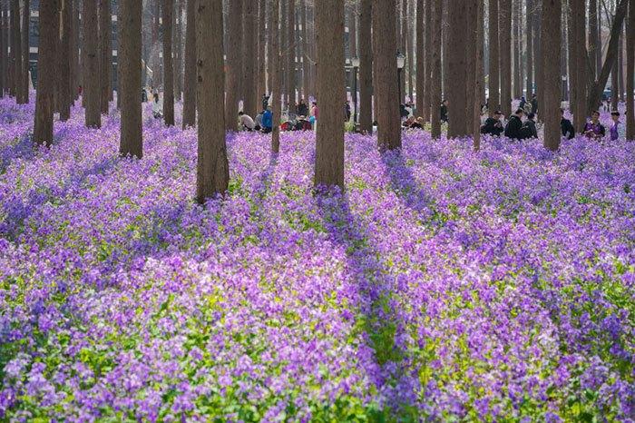 春满校园二月兰盛开 紫色花海景色迷人