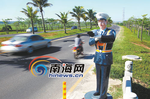 7月6日,一位静态仿真警察手托仿真摄像机,在海口市粤海大道24小时“上岗执勤”。据介绍,日前,海口市交巡警支队在事故隐患多的粤海大道、绕城高速公路等路面,新安装了10位仿真警察。还有10位仿真警察也将在近日陆续安装。其目的是增强路面警示效果,正确引导过往车辆文明安全行驶。(南海网-海南日报/苏晓杰 陈世清 摄)