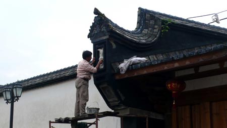工人们说,“刷外墙时,按‘横刷竖直’的方法,头遍刷横,二遍竖盖,走刷直顺,用力均匀,干后就会整体一色。与钢筋水泥等现代建筑材料相比,这些特殊的材料混合在一起建成的房子,不仅防震防火冬暖夏凉,而且隔音的效果也特别好。”(李熙慧/文 黄孔瑜/图)