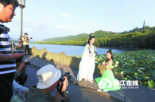 昨天(25日),几位古装爱好者在杭州西湖断桥上演绎白娘子与许仙的故事,引来了市民关注。(梁臻 摄)
