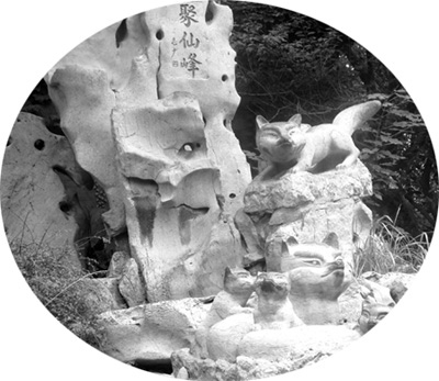 由柳泉沿着曲径小路南行,山势忽高忽低,盘曲荫重。甬路两侧,茅舍、篱笆、古树、瓜架隐现于松林中,走不远便到了狐仙园。园内碑廊亭榭,拱桥九曲,山石倒影,花木扶疏。看那聚仙峰上,狐仙相聚,婴宁在树杈上笑态可掬,小翠在亭中情思悠悠,荷花三娘子含情脉脉立于水中。碑廊沿湖依山而建,一旁雕刻着蒲松龄雕像。著名作家刘白羽在此留下了“青灯展卷鬼神惊,天上人间诉不平。热血铸得沧海泪,奇思妙幻越高峰”的诗句。