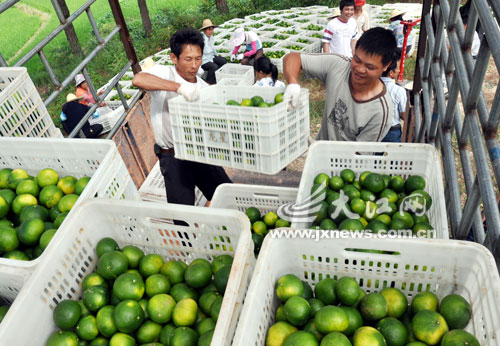日前,在安远县凤山乡凤山村,当地果农将采摘下来的特早熟温柑装箱上车,准备外销。该县积极推广果业新技术、新品种,科学引导果农在脐橙园套种“特早”、“早熟”等投资小、见效快的温柑品种,促进农民增收。