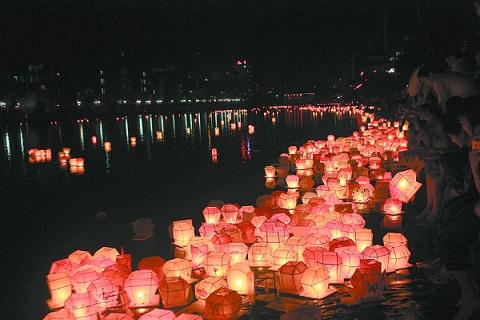 “拜祖公口罗!”9月2日晚(农历七月十四)的那场别具一格的祭祀把河灯歌节推向最高潮,在闪耀的灯光下,在舞狮队的激情表演中,100人合唱队齐喊的声音气震山河。一名身着特制长身道袍、手拿祭文手卷的长者缓缓步入舞台中央,烧高香、叩拜,抑扬顿挫地念出祭文,随即在音乐声中,道公点燃了一根火棒。20名手持蜡烛的女子一一走到道公面前,将蜡烛引燃,继而将安放在舞台两侧的大型河灯一一点燃。“放河灯,放河灯,一个心愿一盏灯;放河灯,放河灯,一个祝福一盏灯。”随着《放灯歌》大合唱,20盏大河灯被缓缓地放到江面上,然后大龙小龙、唐僧师徒、弥勒佛、孔雀、熊猫、仙鹤、雄狮、凤凰、延安灯塔、宇宙飞船等各式河灯相继沿河而下。最热闹的要数群众自由放河灯,模拟西红柿、莲花等农产品形状的大大小小的河灯成千上万地从男女老少各族群众手中放下河去,一个个美好的祝愿于是飘满了资江。万盏河灯耀资江,同时也将游客们一颗颗虔诚的心照得又明又亮。