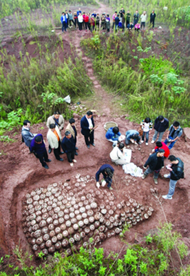 “会不会是古董呢?”崔云骏立即让小男孩带他去看。崔发现因被雨水冲刷,一个约1平方米的两层碗已经裸露出来。随后他取了7个回家。他拿了两个到北碚文广新局鉴定。工作人员发现这碗是清代的碗,12日专程赶往现场,初步估计是清代的碗墓。