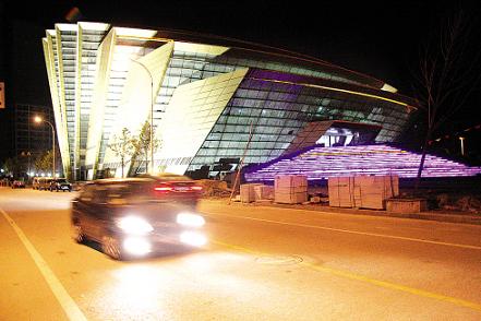 10月21日晚上,温州大剧院夜景灯光正在进行调试,绚丽多变的灯光将大剧院在夜色中映衬得如梦如幻。据悉,温州大剧院投资6.45亿元,建筑面积约3.2万平方米,大剧院主体设施有1501座的豪华歌剧院。为迎接12月26日举行开业首演,大剧院内部和外面景观正在紧锣密鼓地施工,预计本月底大剧院夜景灯光安装完毕。 (曹益民 摄)