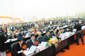 开幕式与重大招商项目签约仪式同台进行。在主席台的前方整齐地排着128张签约坐席,靠后的是一个竖着128个项目名牌的企业家方阵。