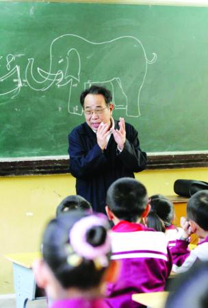 传统牙雕的传人冯蕉生不愧是艺术家,他几笔就在黑板上勾勒出一头大象,然后问同学们,什么材料可以用来雕刻,“木头”、“石头”、“萝卜”,同学们说了好几种,终于说到了象牙。