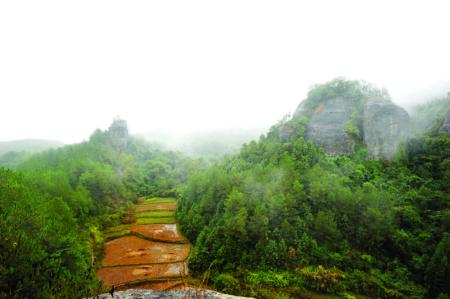 摩陀寨风景区位于福建省龙岩市上杭县汀江河畔庐丰乡。蒙蒙秋雨中,我们的采访车在村道上颠簸向前,越往山里走越觉得清冷。随行的上杭县委宣传部老黄突然喊了句“停车,到了”。到了?寨子在哪里?顺着老黄手指的方向,我们非但没有打消疑问,反而更纳闷:路边树木繁茂,一条青石小径藏匿其中,让人难以相信此处为寨。
