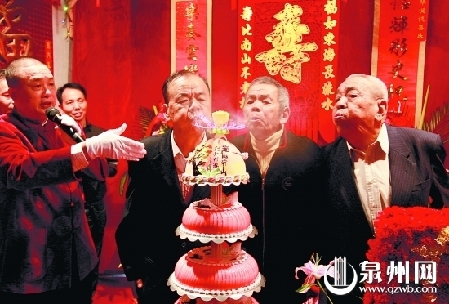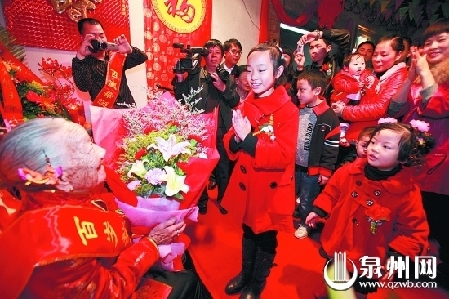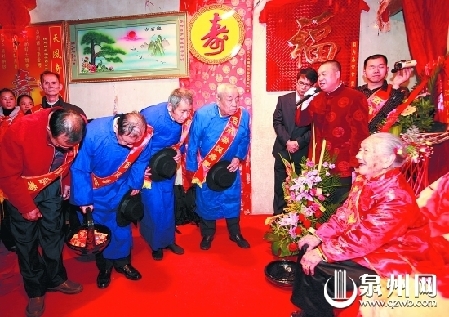 在福建省南安市康美镇康美村,曾经随夫过着清贫日子的陈根,昨日(10日)迎来了自己的百岁生日,155个儿孙全都到场,参照传统拜寿仪式,依序为她鞠躬祝寿。