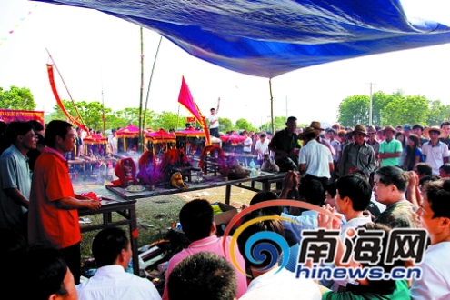 事实上,军坡节与“公期”的关系非常复杂。在形式上,军坡节与公期相近,例如琼海中原、临高多文及万宁、原琼山一带,都闹军坡,有些地方的军坡实质上就是公期;但在有些地方,既在一个大的范围内过军坡节,各村子又有自己的公期。例如新坡镇,全镇各村既有共同的军坡节,但各村还有各自的公期,如梁定川所在保礼村的“公”称为灵山大王,传说中是当地的一位英雄人物。因此,“公期”又分为“大公期”和“小公期”,军坡节时供奉范围比较大的神祖称“大公”,而各村各自供奉的神祖称为“小公”。