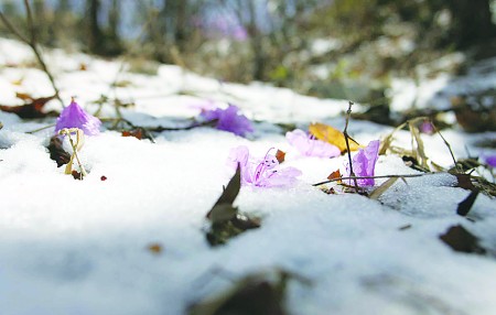 27 日上午,牙后村的一位村民告诉记者:“今天凌晨3点左右,我们这里又是刮风又是下雨,还伴有雷电,不一会竟然飘起了雪花,还伴有少量冰雹,直到早晨8点多雪才停下,现在都4月底了,我还没见过这个时候下这么大的雪”。记者上山,发现了冰雪与鲜花共存的奇观。