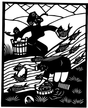关东地方江河纵横,鱼类多达几十种,无船无网的人们都能抓到鱼吃,妇女们去河边洗衣服,用瓢舀水时都能舀上几条鱼来,说明关东地方只要地上有水的地方都有鱼,尤其是下大雨,涨大水的时候,那可真是遍地是鱼呀,冬天水泡子里冻上厚厚的一层冰,人们用冰串子将冰凿开,用搅罗子在冰眼里一搅,就能搅一兜子鱼或哈什蚂上来。冬天雪夜里,在冰眼旁点上一个灯笼,水中的鱼奔亮光,人们就可以用搅罗子往上捞鱼。开春冰化了,还先祭江神、鱼神,再上船下江捕开江鱼,打上头网鱼,用江水炖着吃,原汁原味,这叫打春水,金代皇帝每年还举行头鱼宴呢。