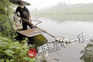 昨日,10多名工人在合川区草街镇那条叫跃进上下堰的河内忙着打捞死鱼——25日早晨至今,河中的鲶鱼、鲤鱼等六七类生态鱼陆续死亡,最大的鲶鱼达四五十斤,最小鱼苗或虾蟹都未逃过劫难。