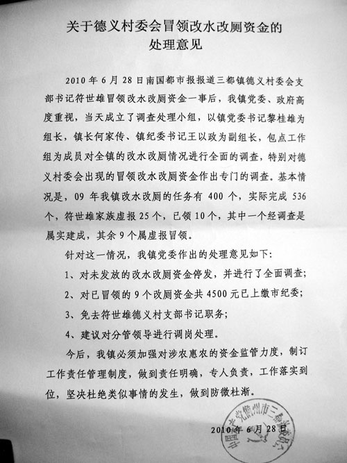 黎桂雄说,调查结果表明,南国都市报的报道是属实的。当天下午该镇立即召开领导班子会议,研究对此事的处理。经镇党委研究决定,作出4点处理意见:1、对未发放的改水改厕资金停发,并进行全面核查;2、勒令符世雄一家退还已冒领的9个改厕补助款共4500元,并上缴市纪委;3、免去符世雄德义村委会支部书记职务;4、建议对分管改厕工作的领导进行调岗处理。