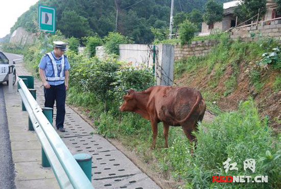 一老汉看到高速公路旁草源茂盛,便将自己的牛和羊赶进来吃草,把绳子拴在高速公路防护网上。7月1日下午,(湖南)醴潭大队荷塘中队民警巡逻至该路段时,发现了这一安全隐患。于是,民警现场当起了“放牛倌”,等了半个多小时,牛和羊的主人才出现,民警又护送老汉将牛羊牵离高速公路。