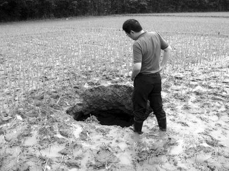 怀远镇政府工作人员尹波也证实说,因为插秧子时向田里灌水,泥土经过浸泡后引起了地面的塌陷。