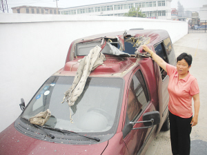泰州新世纪驾校位于梅兰化工集团的东南侧,驾校练车场距离爆炸区中心有500多米远。记者在该训练场看到,不幸被砸中的是一辆紫红色赛宝,车顶被砸出一个篮球大的窟窿。一块1.5厘米厚的扇形铁片,“肇事”后深深嵌在车旁一堵30厘米厚的墙内。整个厚墙几乎被铁片砸穿。