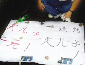昨天中午12点左右,炎炎烈日下,南京市鼓楼区龙江新城市广场旁,一名男子垂头丧气地坐在地上,面前铺着两张各1米见方的白纸,上面分别赫然写着“卖儿子一元!”和“一块钱卖儿子!”