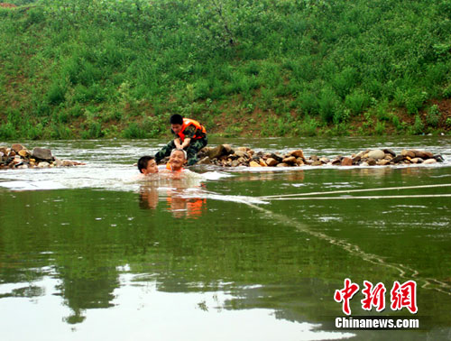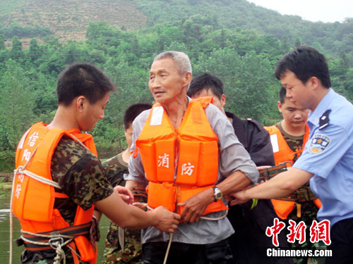 中新网信阳7月7日电(记者 朱晓娟 通讯员 邵伟 李晖) 7月7日上午,信阳新县白果树乡三道河岸边一73岁的古稀老汉到河对岸菜地劳作,突遇暴雨,山洪突发,持续1个小时的暴雨山洪将老汉回家的河滩淹没,闻讯赶到的信阳消防救援人员在激流中成功将老汉救出。