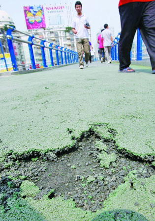 记者问:天桥刚修成仅一个多月,为何会出现大面积破损现象。张成立说,该路段交通异常拥堵,天桥工期赶得非常紧。“由于行人要过桥,影响了施工,所以上面本来要喷的一层固化胶就缺少了,以致地垫黏合性差。现在,我们要在上面再喷固化胶。”