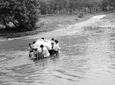 “三轮车刚上路,雨就下大了,瓢泼的一样。”新郎张虎说,三轮车艰难地18次驶过漫水桥来到宋庄时,已是上午8点多了。把艳丽送上花轿,嫁妆装上三轮车后,艳丽的爹娘看了看天,说:“不行了改改日子。”