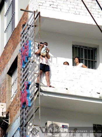 7月25日下午3时许,在南宁双拥路一家招待所的5楼,一个男子抱着一个婴儿站在阳台栏杆外的边沿上,声称要跳楼。最终,经过多方努力,这名男子被解救下来。