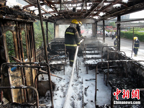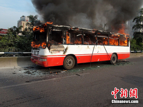 中新网重庆7月26日电(银雪)26日上午7时30分许,重庆一公交车行驶到当地高新区留学生创业园旁突然发生自燃,另一辆路过公交车司机见状立即提灭火器帮忙灭火,在驾驶员自行扑救失败后消防官兵赶到现场将大火扑灭,但公交车已被烧得只剩框架。