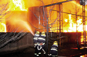 在这两处大火的北侧,是一个约二三十米高的酒精罐,这个本是圆柱形的大罐子,已经被烧得严重变形。顶部还不时冒出蓝色的火焰。与其紧邻的一个大酒精罐也已被大火烤得变了形。爆炸的巨大冲击波推倒了该酒精厂半边围墙。